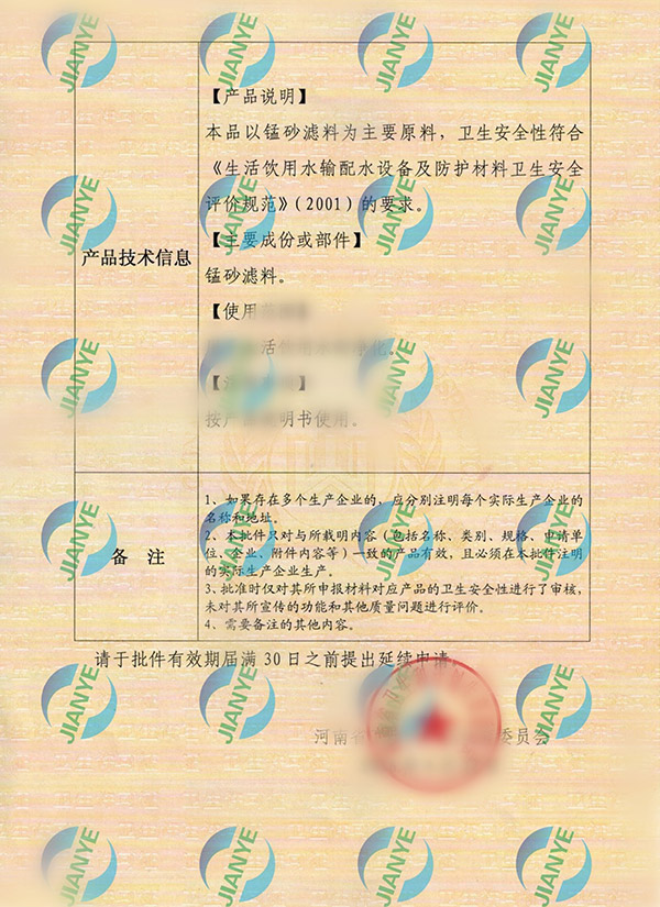 16-20建業(yè)牌錳砂濾料衛(wèi)生批件